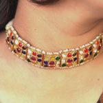 This eye-catching Navratna Sleek Choker is crafted from plated gold, 92.5 Silver, and Semi Precious Stone, making it a beautiful addition to any Bridal look. Enjoy a sturdy and lightweight design with long-lasting shine.