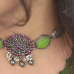 The Machli Oxidized Choker is an exquisite piece crafted from 92.5 Silver and Semi Precious Stone. The deep oxidation of the Silver accentuates the stone settings, enhancing its beauty. Perfect for a formal setting, this choker is the ultimate statement piece.